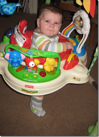 and when he got tired of the jumperoo, his mama took him to the couch to play with toys…